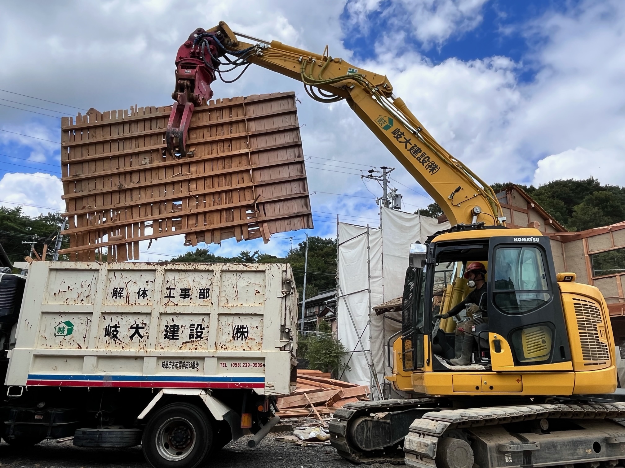解体工事現場で手や重機を使っての解体作業