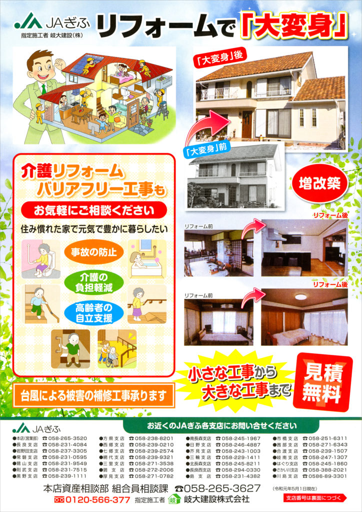 JAぎふ(ぎふ農業協同組合)の指定業者として40年余り、組合員の皆様や職員の皆様にはたいへんお世話になっていると同時に大きなご信頼をいただいております。小さな営繕工事から新築工事、災害時の被害の補修工事等、どこに相談して良いのかわからないような案件でも迅速に対応させていただきます。また、空き家や使われなくなった農業倉庫、ビニールハウス等の解体撤去工事、立木の伐採・伐根工事もお気軽にご相談ください。お見積りは無料でさせていただきます。