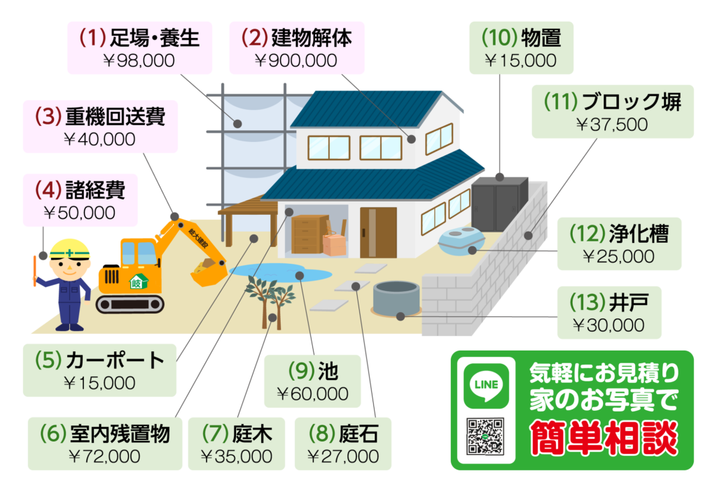 ⼀般的に⾔われる「坪単価」は建物本体の解体⼯事費⽤です。付帯物がある場合には付帯⼯事費がかかります。解体業者のホームページなどで、「坪単価〇万円」などと書かれていると、建物の⾯積にその坪単価をかけると解体費⽤が計算できると考えがちですが、敷地内にブロック塀や樹⽊、室内に残置物などがある場合には付帯⼯事費がかかるので注意が必要です。